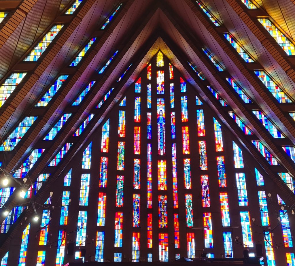 | Natural light is transmitted into the interior through the entrance gable of coloured glass, the glass linking the segments of the roof, the coloured glass walls of the side aisles and the opaque colourless glass of the side aisles.The vast expanse of stained glass is used with dramatic impact, its symbolic effect is undeniable. The slim panels of leaded glass between the roof segments give the illusion of extending the huge gable of stained glass on either side of the Pentecost scene. They only come fully into view for the ministers at the altar and the communicants returning from communion. The light transmitted through the coloured glass representing the Holy Spirit may be seen as symbolic of the communicant’s reception of the Eucharist and its spiritual effect. The abstract patchwork of coloured glass set into heavily textured cement in the side aisles also deserves attention. The colours of the glass change as they advance towards the sanctuary, from predominantly red and purple through blue and mauves to yellow, amber and colourless glass.One of the outstanding features of the church is the giant triangular stained glass window at the entrance gable to the church, broken only by a pair of doors flanking a carved wooden statue of St Anthony over which projects a cantilevered gallery. The window, designed by Richard King, depicts the Holy Spirit coming on Our Lady and the Apostles at Pentecost. Set beneath the apex of the triangle is the Holy Spirit in the form of a dove. A circular ball of fire in red, orange, purple and yellow suggests the spiritual enlightenment bestowed by the Holy Spirit. The elongated figures of Our Lady and the apostles, in shades of green and purple, are set within. Our Lady is centrally placed and the eleven apostles each carrying his own symbol or attribute are distributed around her. Simon the Zealot carries a saw, St Jude a lance, St Matthew a purse. The Pentecost scene is set within a vast triangular expanse of stained glass measuring about 82 feet by 70. It is breath-taking in its colours of flame red, plum, burgundy, amber, gold, azure, aquamarine, turquoise and lavender. The diameter of the Pentecost scene is about 36 feet. The parish is very proud of the fact that the stained glass was put in place by Michael Roche of St Patrick’s Road. Michael has maintained all the stained glass since the church opened. |